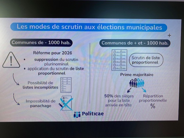 LES REGLES DE SCRUTIN CHANGENT : IL NE SERA PLUS POSSIBLE DE PANACHER LES LISTES, LE VOTE DOIT PORTER SUR LA LISTE ENTIERE (LOI DU 21/05/25). AINSI UNE ENVELOPPE CONTENANT DEUX BULLETINS, OU UN BULLETIN AVEC UNE SEULE MENTION MANUSCRITE (MEME UNE RAYURE) SERA COMPTABILISE COMME NUL.